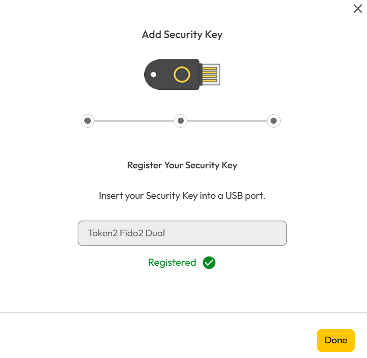 9) Then you need to press the button on the security key to complete registration. Note: Security keys differ in the exact instructions to activate them. Your key may require a tap or button press to activate registration.