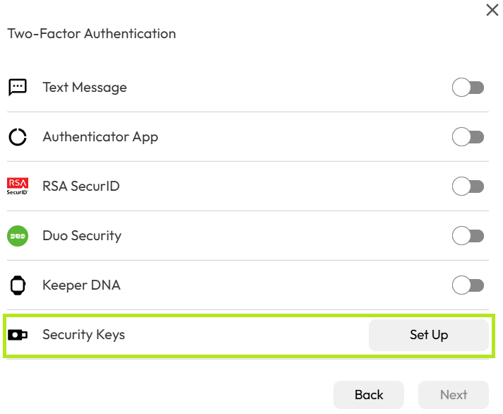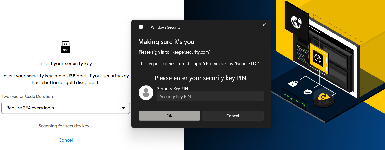 • An access to the Keeper Web Vault/Keeper Admin Console.• Admin access to enable security keys (not required if security keys are already enabled).