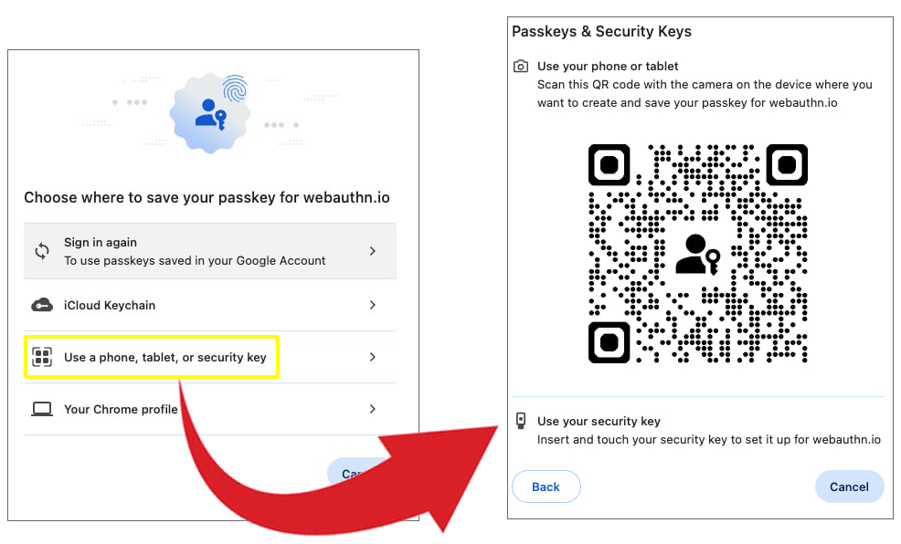 ■ Chrome on macOS (choose ‘Use a phone, tablet, or security key’, and when the dialog with a QR code appears, plug in and touch the security key):