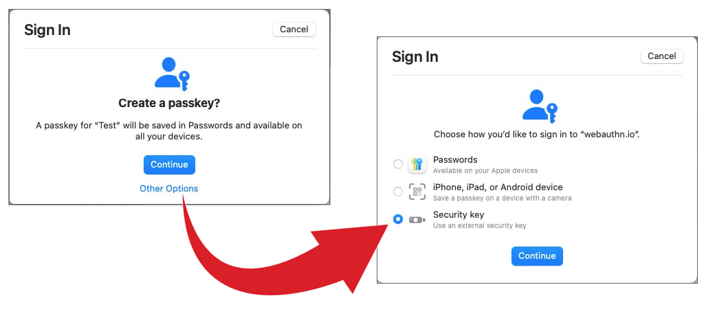 ⚠ On macOS (Ventura and newer), when passkeys are enabled at the OS level, the system defaults to using the built-in authenticator (e.g., Touch ID) without showing other options. To use a physical security key instead, you must click Cancel on the initial prompt—this non-intuitive step reveals the usual selection menu where Security Key can then be chosen.