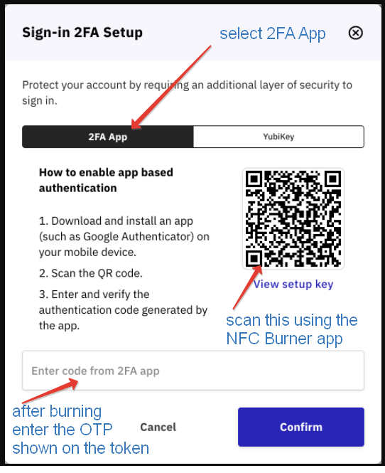 Select 2FA App from the different options (2FA App, Yubikey, Password)