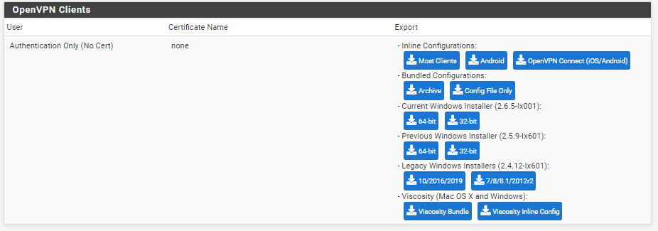 Go to VPN/OpenVPN/Servers/Client Export,scroll down to the OpenVPN Clients area, and download the OpenVPN client setup bundle with configuration.